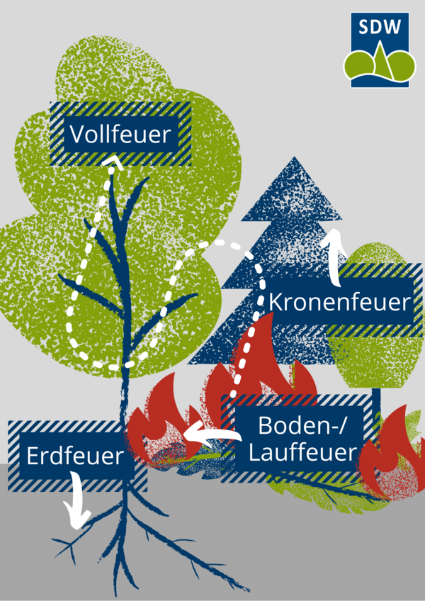 Die meisten Waldbrände in Deutschland treten als Bodenfeuer auf, bei denen die organische Schicht des Bodens und die Laubstreu verbrennen. Wenn viel brennbares Material zur Verfügung steht und die Brandgefahr hoch ist, können sich diese Brände zu sogenannten Vollfeuern entwickeln, die das Kronendach des Waldes erreichen und zerstören. Diese führen zu erheblichen ökologischen Schäden.